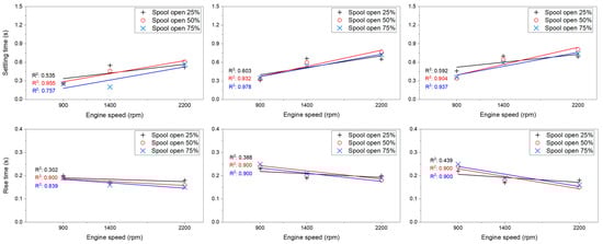 Figure 9 presents the results of a regression analysis on the settling time and rise time of flow rate, pressure, and hydraulic power responses with respect to engine speed. In theory, higher engine speeds and greater spool openings should lead to an increased rate of change in flow per unit time, thereby reducing both the settling time and response time. However, several factors caused deviations from this expected trend.