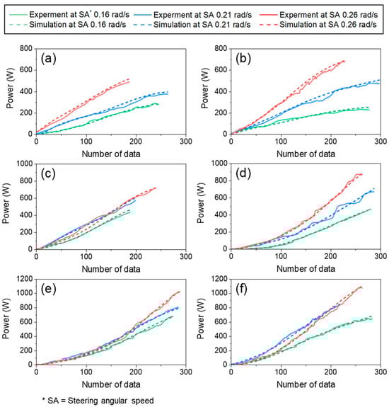 Evaluation of hydraulic power prediction accuracy in the EHPV simulation model across various operating conditions: case (A) = left turn, engine speed 900 rpm; case (B) = left turn, engine speed 1400 rpm; case (C) = left turn, engine speed 2200 rpm; case (D) = right turn, engine speed 900 rpm; case (E) = right turn, engine speed 1400 rpm; and case (F) = right turn, engine speed 2200 rpm. Subscripts 16, 21, and 26 denote target steering angular speeds of 0.16, 0.21, and 0.26 rad/s, respectively.