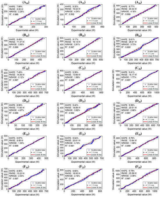 To assess the accuracy of hydraulic power predictions in the EHPV simulation model, an identity line fitting was conducted, as illustrated in Figure 11. In the figure, the dashed line represents the 1:1 line, where experimental values are plotted on the x-axis and simulation values on the y-axis. The red line shows the linear fit of the simulation data. The degree to which the linear fit deviated from the 1:1 line highlighted potential bias or nonlinearity in the simulation model.