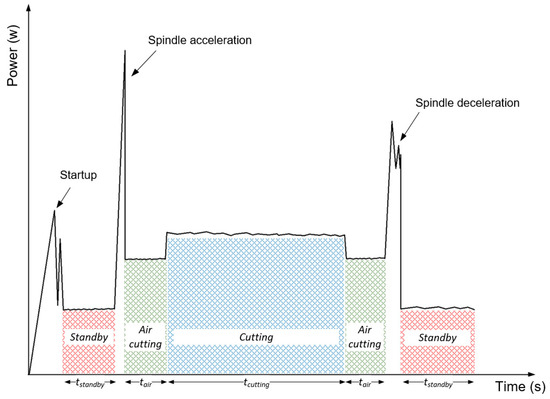 Power measurements depend on various preconditions that affect the obtained data, and standardized test procedures are necessary [10]. Dahmus and Gutowski’s energy analysis method separates the power demand of machine tools into three modes: standby, air-cutting, and cutting (Figure 2) [11]. The power demand for chip removal varies based on the machine’s load. The electrical energy is consumed by various computer numerical control (CNC) components, including the controller, servo drive, control systems, fans, pumps, lighting elements, and coolant.