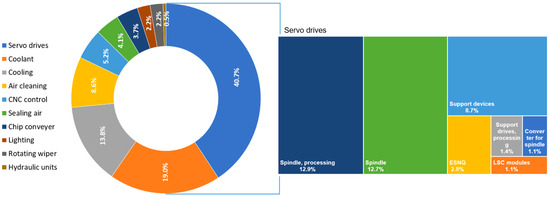 Accurately measuring power consumption for machines and processes is crucial for optimization, as reliable data collection enables informed decision-making and effective analysis. For example, the servo drives responsible for chip removal account for 40% of the total power consumed from the main supply, while other CNC units utilize the remaining electricity in varying proportions (Figure 3) [13,14]. Axial and spindle motors play a key role in achieving desired cutting parameters, such as cutting speed, feed rate, and depth of cut, by adjusting their speed and power accordingly. These motors operate at varying frequencies, adapting quickly to changes, which highlights the importance of precise power measurements.