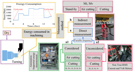 The Direct method is divided into two: the Considered method (a1 in Figure 4), which takes variable frequency into account, and the Unconsidered method (a2 in Figure 4), which does not consider it. Clamp-on ammeters and voltmeters are commonly used to measure the power consumed by CNC engines with the Unconsidered measurement method [22,26,27]. Measurements made with advanced power analyzers operating below 50 Hz are also included in this method. In the Unconsidered method, it may not be considered that servo motors have variable frequency, and the measuring instruments without True-RMS capability may be used.