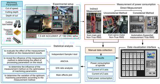 This study presents a statistical investigation based on experimental results to test the validity of an advanced Automation-Supported measurement method for energy efficiency in CNC machining. The framework of the experimental setup and statistical analysis used to evaluate different energy consumption measurement methods during processing is given in Figure 5. It outlines the machining parameters, experimental setup, measurement approaches, data collection process, and result visualization interface developed in the study.