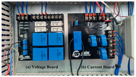The custom power analyzer (number 3 in Figure 6a,b) consisted of a current and voltage measurement board to calculate the power values over the axes (X and Z) and spindle motors during the cutting phase. Both boards can measure variable frequency current and voltage values for up to four axes (Figure 7). The main task of these cards is to reduce the high current (100 A) and voltage (500 V) values that occur in the motors during the cutting process to current and voltage levels that a microcontroller can measure. CNC milling and lathe machines have distinct motor powers for their spindle and axes. The spindle reaches the highest torque among the motors. Axis motors generally require lower torque compared to the spindle motor.