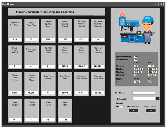 The developed interface (Figure 8) facilitates PLC-PC (personal computer) and CNC-PC communication, enabling real-time machining and measurement data visualization. This communication between the components ensures that energy consumption data are presented promptly and accurately, allowing operators to monitor and analyze the machining process effectively. The interface provides energy consumption, G code data, and essential machining data such as axis coordinates, machining times, and the number of parts (Figure 9).
