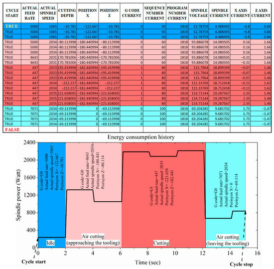 While real-time electrical and processing data obtained through the data visualization interface were collected, the process was automatically started according to the status data of the CNC and ended with the cycle start and stop information. Data were collected at 100 ms intervals, and some Excel lines were removed for simplicity. Energy consumption data were associated with CNC status data thanks to Automation-Supported measurement. Some of the data collected by the interface are presented in Figure 9 for clarity.