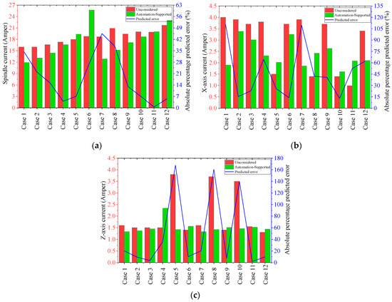 The average current values consumed by motors: (a) spindle, (b) X-axis, and (c) Z-axis motors. Prediction error was calculated using the formula “absolute percentage predicted error (%) = |((Unconsidered − Automation-Supported)/Automation-Supported) × 100)|”.