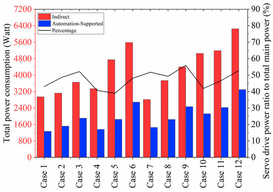 The total power values measured from the main phase and the power consumed by the servo driver are shown in Figure 11. There was a linear relationship between Indirect and Automation-Supported, unlike the relationship between Unconsidered and Automation-Supported methods. This is due to the standard 50 Hz of the CNC main phase, which is not affected by variable frequency measurement. However, the total power calculated by the Indirect method also includes the power consumed by various CNC components, such as the controller, fans, lighting elements, and coolant, which have no direct effect on the cutting parameter. In all experiments, the total energy consumed by the CNC components is higher than the total power consumed by the servo drive, confirming that the other components also consume energy. Moreover, the experiments showed that the power consumed by the servo driver ranged from 39% to 56% of the power consumed by the main phase, consistent with the rate of 40.7% in Figure 3 and reported in the literature [11]. It can be concluded that optimization of machining parameters based on CNC main phase power consumption evaluation may lead to inaccurate results.