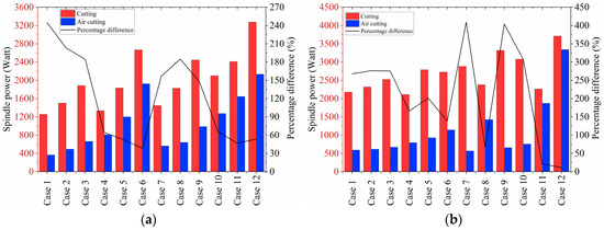 The power consumption in the spindle was measured using (a) Automation-Supported and (b) Unconsidered methods. The black line illustrates the percentage increase in spindle power consumption during the cutting phase compared to the air-cutting phase.