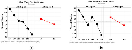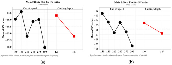 Main effect plot for S/N of spindle power consumption according to measurement method: (a) Unconsidered and (b) Automation-Supported.