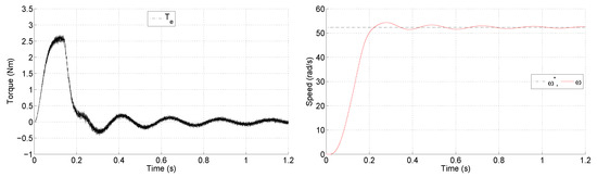 Transient conditions are found for changes in reference speed. A series of step tests will be used for the Pareto analysis. In these tests, the speed set point is changed following a step as shown in Figure 4. For clarity, the case portrayed there corresponds to a start test in which the motor is not running at the start of the test. It is worth pointing out that, in most reports, the only figures of merit considered are derived from speed, including overshoot, rise time, integral absolute error, and integral time absolute error. However, torque ripple is not visible in these figures of merit as seen in Figure 4.