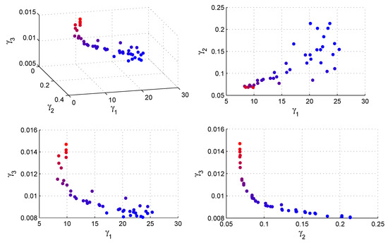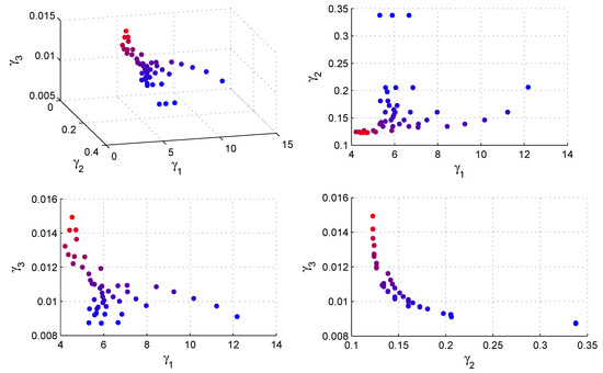 The combinations remaining, after the trimming process, form a set that can be interpreted as an approximation to the Pareto front. They should lay in a lower dimensional surface as will be shown later. Points in set are shown in Figure 5 in conjuction with some projections. In those, values are shown in colour. The colour is computed as a linear function of . The red hue corresponds to higher , conversely, the blue hue corresponds to lower . Please note that colour is added just to enhance the 3D perceptions.