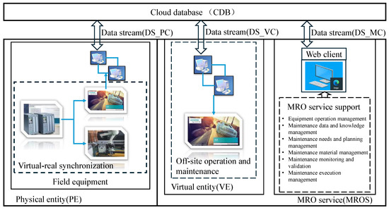 In the formula, PE represents a physical entity, VE represents a virtual entity, MROS represents an MRO service, CDB represents a cloud database, and DS represents the data stream between various communications. According to Equation (1), the structure of the MRO DTRS model is shown in Figure 1.