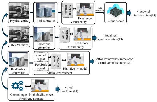 In this paper, after the MDTRS is constructed, the technology for realizing the DTRS is subdivided into four levels in terms of functions, as shown in Figure 2. These levels are virtual simulation, software/hardware-in-the-loop virtual commissioning, virtual–real synchronization, and cloud–end interconnection. In these four levels, starting from virtual simulation and gradually increasing functions and modules, the level is gradually improved and finally constitutes all the main technologies of DTRS in the cloud–end interconnection stage. In the application process of DTRS, there exist both inclusive and horizontal relations between the upper and lower levels of these four technology levels.