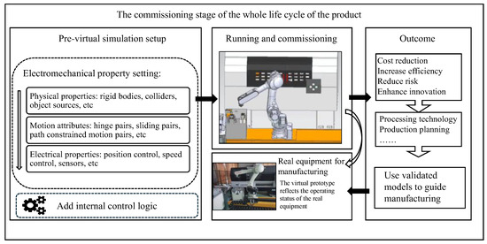Virtual simulation, as the first level, is the basis for providing DTRS. Any software equipped with a physics engine can achieve virtual simulation in the mechanical industry. The key to virtual simulation technology lies in using simulation software with a physics engine to create a virtual prototype that reflects the actual equipment operating state of the real equipment, as shown in Figure 4. During the commissioning stage of the whole life cycle of the product, the three-dimensional model of the equipment is added to the simulation software, and the electromechanical properties and internal control logic of the model are added to the virtual environment of the simulation software. In the virtual environment of the simulation software, electromechanical properties and internal control logic are added to the model. The electromechanical properties mirror the real equipment’s running properties, while the control logic drives the model to move according to the preset motion mode. After completing the virtual simulation setup, the software is run and commissioned. The virtual prototype in the simulation software can reflect the operating status of the real equipment. In this process, errors can be identified in advance, allowing for product optimization prior to manufacturing. This can lead to cost reduction, efficiency improvement, risk mitigation, and enhanced innovation capabilities. Subsequently, the corresponding production plan, processing techniques, and other production and manufacturing documents are formulated. The model, having been verified through virtual simulation, is then used to guide production and manufacturing.