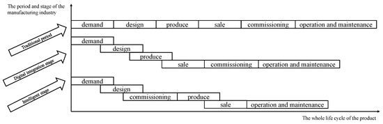 In the traditional product life cycle, the order of design, manufacturing, commissioning, operation, and maintenance is fixed. The manufacturing industry begins to produce parallel designs after entering the stage of digital integration, and the order of the product life cycle overlaps. In the intelligent manufacturing stage, the digital twin technology has made great progress, and the overlapping part of the order in the product life cycle has increased or even completely changed. Figure 5 shows the relationship between the whole life cycle of a product and the period and stages in which the manufacturing industry is located.