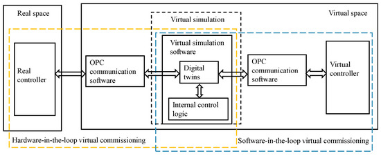 When the model design is completed, on the basis of the virtual simulation realized in the simulation software, the input and output signals are added, as shown in the schematic diagram of the software/hardware-in-the-loop virtual commissioning technology shown in Figure 6. The real controller in the real space can be connected with the signal in the simulation software through the OPC communication software. Similarly, the virtual controller in the virtual space can be connected to the signal in the simulation software via the OPC communication software. In this way, the control of the simulation model by the external controller is realized. The hardware-in-the-loop virtual commissioning is constituted when the real controller is used, and the software-in-the-loop virtual commissioning is constituted when the virtual controller is used. The use of software/hardware-in-the-loop technology can verify the effectiveness of communication and control logic and provide a foundation for subsequent virtual–real synchronization technology and cloud–end interconnection technology.