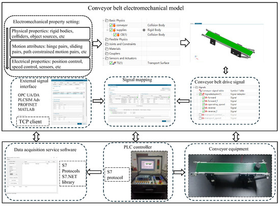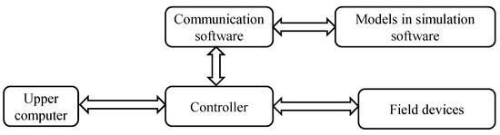 The synchronization principle of virtual–real synchronization is illustrated in the schematic diagram shown in Figure 7. The upper computer is connected to the controller, and the controller realizes two-way communication with the field device and communication software, respectively. Additionally, the equipment model in the simulation software is connected with the other end of the communication software, enabling real-time communication between the controller and the equipment model.
