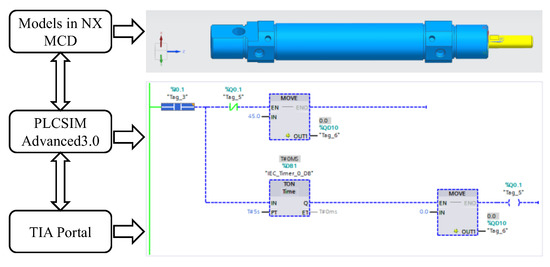This paper uses the control case of cylinder assembly to show the process of realizing virtual and real synchronization. The synchronization process is simulated utilizing TIA Portal, PLCSIM Advanced 3.0, and NX MCD. The synchronization principle is illustrated in Figure 8. PLCSIM Advanced 3.0 simulates the real PLC, while the model in MCD simulates the field equipment. This paper takes the cylinder assembly model located in the upper right corner of Figure 8 as an example for experimental verification. In the lower right corner of Figure 8, a PLC control program is presented. The function of the program is to control the position of the cylinder rod to move to 45 mm (the cylinder rod movement speed has been set to 10 mm/s in the MCD); after the cylinder rod starts to move, the timer starts to time for 5 s, and after 5 s, the cylinder rod shrinks to the initial 0 mm position.