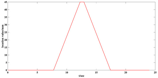 Through experiments, the location curve of the cylinder rod’s motion position, as shown in Figure 9, is obtained. The curve indicates that the highest location value reached is 45 mm, after which the curve returns to the position of 0 mm. At the top of the figure, there is a straight line where the location value remains unchanged. This is because it takes only 4.5 s to reach 45 mm, but the timer is set for 5 s, resulting in the straight-line segment at the top. The process aligns with expectations, and the implementation principle of virtual and real synchronization is also verified.