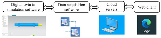 Cloud–end interconnection constitutes the fourth level of virtual commissioning, serving as the foundation for generating MROS and furnishing technical support for remote operation and maintenance. The fundamental principle of cloud interconnection is illustrated in Figure 10. Utilizing data acquisition software, the system ensures that model motion data from the simulation software is stored in real time on the cloud server database. The web terminal retrieves this real-time model motion data from the cloud server, enabling it to display the model’s motion. Additionally, the web client can exercise control over the motion of the MCD model by modifying the data resident on the cloud server.