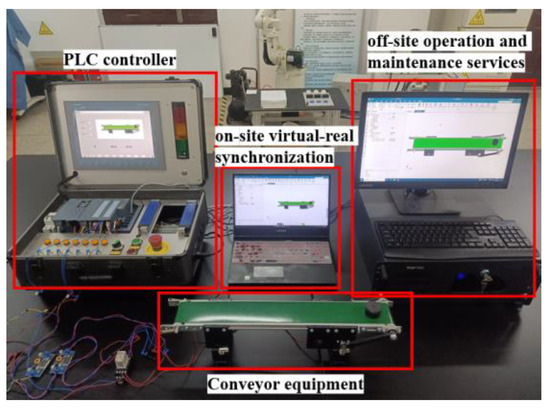 Step 5: Conduct a digital twin remote operation and maintenance experiment. The process is shown in Figure 16. The first row is the conveyor belt equipment. On the second row, the PLC controller is on the left, the laptop in the middle is the “on-site computer”, and the IPC on the right is the “off-site computer”. The “on-site computer” realizes the virtual and real synchronization with the conveyor belt equipment, while the “off-site computer” VE and the local PE form virtual and real synchronization. The figure illustrates the synchronization of these environments between local and remote locations at this moment, and the running status of local devices is mapped in the remote VE.