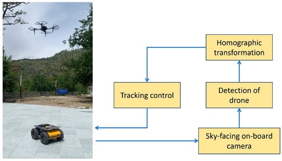 - Santos, M.F.; Castillo, P.; Victorino, A.C. Aerial Vision Based Guidance and control for Perception-Less Ground Vehicle. In Proceedings of the 2024 European Control Conference (ECC), Stockholm, Sweden, 25–28 June 2024; pp. 2780–2785. [Google Scholar]