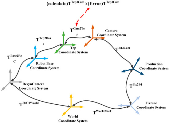 Benchmark detection uses the internal visual positioning module of the end effector of the mobile robot automatic drilling system [20] to identify the image pixel coordinates of the center position of the benchmark hole, and then converts it to the position information in the robot end effector coordinate system, and finally obtains the corrected robot hole position to be processed. The benchmark detection process first needs to establish the world coordinate system (World), robot base coordinate system [21] (Robot Base), tool coordinate system [22] (Tool), benchmark detection camera coordinate system (Camera), resynchronized landmark camera coordinate system (ResynCamera), product coordinate system (Production), and fixture coordinate system (Fixture). The coordinate system of the benchmark detection process is shown in Figure 3.