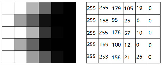 Referring to Figure 5, there is no change in the shadow, the absolute value of the intensity is 0, and the change is −255 when the color changes from a grayscale value of 255 to a grayscale value of 0. The more obvious the grayscale difference value in the sampling image, the greater the deviation value obtained by differentiation, and the edge intensity waveform is shown in Figure 6.