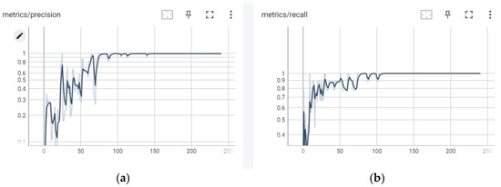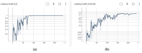 In this experiment, various performance indicators are analyzed through the training process of the YOLOv5 model. The pixel size of the image input is 640 × 640, and the stochastic gradient descent (SGD) optimizer is used for training for a total of 250 rounds. The initial learning rate is set to 0.01, the batch size is 4, and the momentum is set to 0.937. Figure 9 and Figure 10 show the changing trends of the mean average precision (), precision, and recall of the model during the training process.