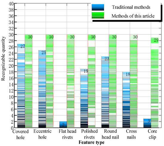 Verification of the effectiveness of benchmark identification: The effectiveness verification of the recognition algorithm is mainly to verify whether the benchmark detection algorithm can accurately detect the assembly benchmark in the image. First, it is necessary to complete the image acquisition work. The mobile robot automatic drilling system is used to collect various types of assembly benchmark images on the simulation parts, including occluded holes, eccentric holes, flat head rivets, polished rivets, round head nails, cross nails and through-hole clips. There are seven types of assembly benchmarks; each type has 30 test samples, as shown in Table 3. The comparison of the effectiveness of the traditional Hough transform circle detection method and the improved method in this paper is shown in Figure 12, and the number of identifiable benchmark features is counted, respectively.