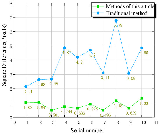 Verification of benchmark recognition accuracy: To facilitate the comparison of the accuracy of benchmark center recognition, a through-hole benchmark with a higher recognition rate of the traditional Hough transform circle detection algorithm is selected, and 10 groups of benchmark image results are identified for calculation. The calculation method is used to calculate the square difference with the measurement results of the third-party measurement software VisionMaster (VisionMaster4.2.0) from Hikvision company (Hangzhou, China). The VisionMaster measurement software was selected as a benchmark for calculating variance due to its industry recognition and proven accuracy. By comparing our method to this reference, we were able to assess its performance and demonstrate improvements in measurement accuracy. is the measurement value of the third-party measurement software, is the measurement result value of the traditional Hough transform circle detection method, and is the measurement result value of the algorithm in this paper. The square difference between the measurement values of the two methods and is calculated to obtain the error values and , as shown in Equation (27).