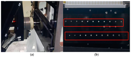 In order to verify the final drilling accuracy of the algorithm, a mobile robot automatic drilling system was used to perform benchmark detection and drilling experiments on the curved test drilling plate. The experimental drilling process diagram is shown in Figure 14a. The material of the plane wall panel is a composite material CF2P, with a thickness of 5 mm and a hole diameter of 5 mm. The mobile robot automatic drilling system was used to make two benchmark holes at an interval of 250 mm on the experimental wall panel, making two groups of upper and lower holes. Then, the improved algorithm in this paper and the traditional algorithm were used to perform benchmark feature hole recognition to perform benchmark detection and complete automatic drilling. Theoretical points were generated by offline programming, where the theoretical hole spacing was 25 mm. After the processing was completed, a laser tracker was used to measure the hole positions compensated by the benchmark feature recognition of the two algorithms. The Spatial Analyzer (SA) software was used to calculate and analyze the position accuracy of the holes.