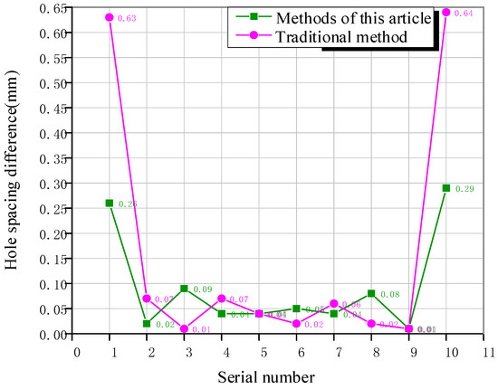The actual measurement value of 11 points in each row is further calculated to calculate the spacing between two adjacent holes, and the difference is calculated by comparing with the standard hole spacing. The standard spacing is the actual distance between the two measured benchmarks divided into 10 parts as the standard spacing value, and is used as the standard reference value for calculating the difference. After calculation and analysis, as shown in Figure 15, the maximum difference between the measured hole spacing of the algorithm in this paper and the corresponding standard spacing is 0.29 mm, while the maximum difference between the hole spacing of the traditional Hough transform circle algorithm and the measured value is 0.64 mm. Comparative analysis shows that the accuracy of automatic drilling by the robot using the benchmark detection algorithm in this paper has been significantly improved, and the data are summarized in Table 6 below.