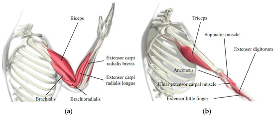 Muscle stress of elbow flexion and extension [16]. (a) Elbow flexion. (b) Elbow extension.