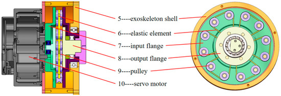 The internal structure of the powered wearable compliant elbow joint exoskeleton is shown in Figure 3. The upper arm plate is fixed with the exoskeleton shell, and the lower arm plate is connected to the output flange. The wearer fixes the upper and lower arm plates on the forearm and the upper arm using the binding device. The input flange is used as the input end and the external driving servo motor is connected. The flexible unit is a combination of elastic elements and pulleys. The torque transmitted from the input flange passes through the elastomer and produces attenuation, so that it cannot be completely transmitted to the output flange. The two produce relative rotation, so that the whole mechanism has the characteristics of flexible drive.