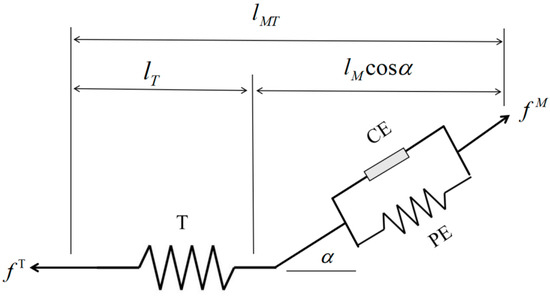 The length of muscles (), tendons (), and muscle–tendon actuators () are related as follows in Equation (12)