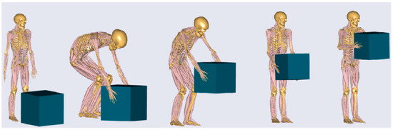 We simulated the behavior of the human body carrying in the AnyBody Modeling System, defined the interactions and constraints between the box and the hand, and ensured a true representation of the physical dynamics involved. We stablished the definitions of the pertinent nodes to ensure seamless synchronization of the box movement with that of the arm, reflecting accurate dynamic interactions within the simulation. A simulation of the processing action is shown in Figure 7.