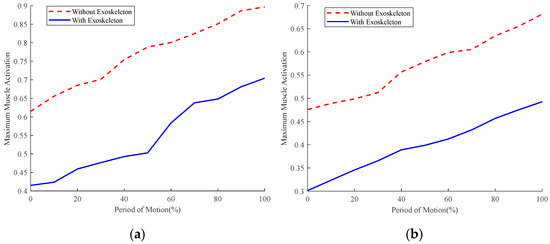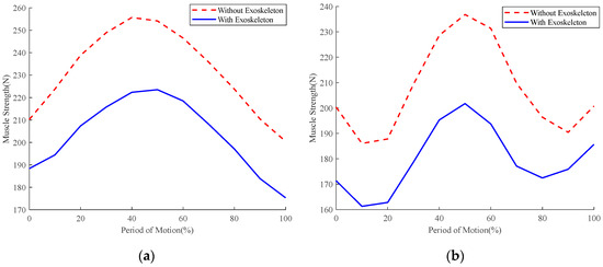 As illustrated in Figure 9a, the application of the powered elbow joint exoskeleton resulted in a reduction of approximately 40 N in the force exerted by the biceps muscle. The assisting efficiency of the exoskeleton is about 24%. Similarly, as depicted in Figure 9b, the triceps muscle force cancels out by about 30 N following the use of the elbow joint power exoskeleton, and the efficiency is about 12%. It can be concluded that the powered wearable elbow exoskeleton supplies a significant compensatory force to the arm muscles, thereby diminishing the muscular effort that must be exerted by the individual.