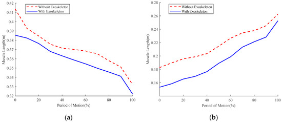 The length–tension relationship of a muscle indicates that when a muscle is activated, its length experiences a non-linear response related to muscle tension [32]. Muscular force output diminishes when muscles operate at lengths that are either excessively long or short. Figure 11a shows the curve of biceps muscle length before and after wearing the elbow exoskeleton. Figure 11b shows the curve of triceps muscle length before and after wearing the elbow exoskeleton.