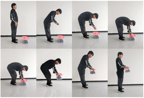 The subjects performed the same repeated weightlifting and standing experiments with and without wearing the elbow exoskeleton. Each set of movements was replicated three times, and the muscle stress of the biceps and triceps of the human arm was recorded and compared, respectively, in the two states. To enhance muscle activation, the subjects carried a load of 25 kg to accomplish the handling test. The experimental demonstration process is shown in Figure 14.