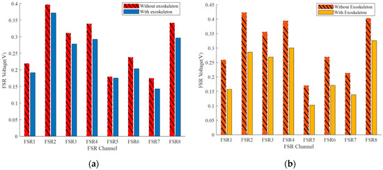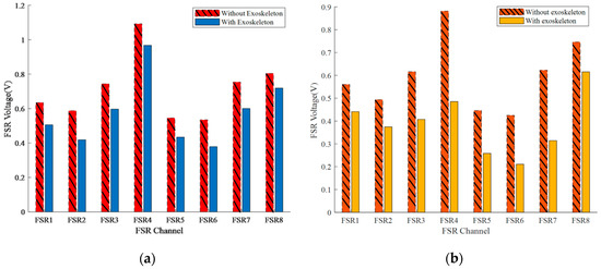 During the experimental phase, the subjects conducted the continuous transportation experiment. Figure 15 shows the histogram of the FMG mean values of biceps and triceps before and after the extension of the elbow exoskeleton.