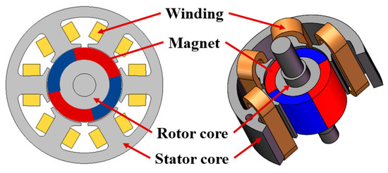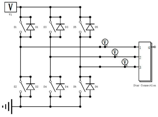 A six-slot four-pole BLDC was used for the FEM analysis. The motor has an internal rotor structure, and its main parameters are shown in Table 1. The motor’s structure is shown in Figure 2. The axis of the N-pole of the rotor is aligned with the U-phase axis in the initial position. The rotor running direction is counterclockwise. This brushless DC motor uses an inverter control circuit, as shown in Figure 3.