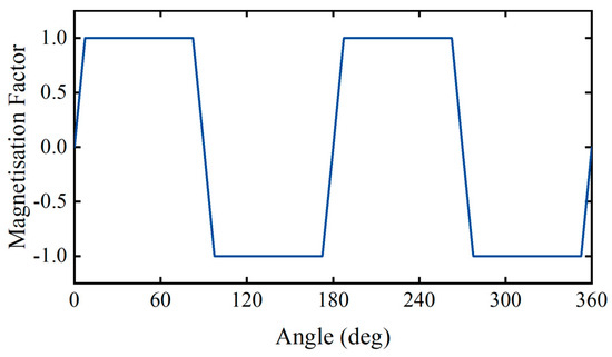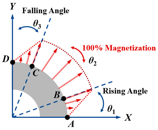 The motor uses a bonded Nd-Fe-B magnet ring. The bonded PM has a radial four-pole magnetization, and the magnetization waveform is trapezoidal, as shown in Figure 4. The single pole cross-section of the four-pole ring is shown in Figure 5, with a width of 90 deg. It can be divided into three areas: the BC (θ2) area with a width of 75 deg, which is charged to magnetic energy saturation, called the main magnetic area; and AB (θ1) and CD (θ3), which are the transition areas between the poles, with pole widths of 7.5 deg. In these areas, the magnets are not magnetized to saturation, and are called the weak magnetic zones.