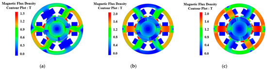 Flux maps of motor magnetic flux density for different load cases: (a) normal load, (b) 1.5 times load, (c) double load.