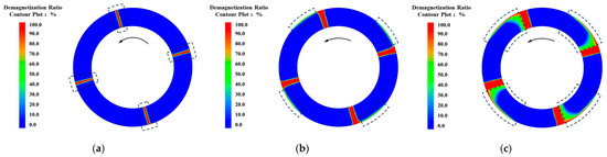 The cloud of the magnetic flux density distribution for different cases of the motor, combining the effects of temperature and armature response, is shown in Figure 6. At the same FEM time-step, an increase in load leads to an increased armature reaction effect and a significant local reduction in the flux density of the magnet occur. The cloud plot of the DMF rate distribution of permanent magnets calculated according to Equation (1) is shown in Figure 7. The arrow in the Figure 7 indicates the direction of motor rotation. There are four weak magnetic zones with low magnetic flux density between the main magnetic poles, as shown in the dotted line position. According to the DMF rate calculation method, the demagnetization of these four weak magnetic zones is at a high level in the initial state. This is unavoidable in the multi-pole ring magnetization process.