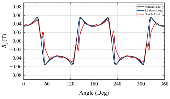 Figure 15 shows the Bs of the magnet ring at the mid-axial position. Consistent with the FEM analysis shown in Figure 10, the DMF occurs on the left side of the peak position. Therefore, the Bs in the left of each pole in Figure 15 is significantly lower. The magnetic area in the normal case at this location is 16.64 T·deg. The magnetic area is reduced to 15.38 T·deg in the 1.5 times load case and reduces to 14.39 T·deg in the double load case. Due to the overall reduced flux density of the magnet ring, the Bs amplitude on the right side of the poles is also lower than normal ring. Figure 16 shows a harmonic analysis of the Bs. As the DMF increases, the amplitude of both the fundamentals and harmonics decreases.
