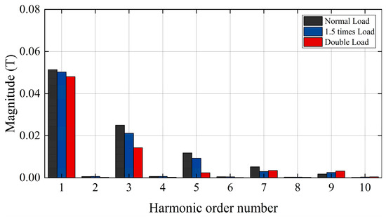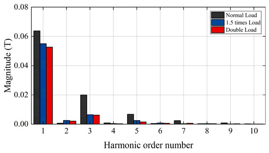 where H is the highest harmonic order, n is the harmonic order, Gn is the nth harmonic amplitude, and G1 is the fundamental wave amplitude. As Table 2 shows, the THD of the Bs in the normal load case is 54.9%, in the 1.5 times case is 46.7%, and in the double load case is 31.7%. It was found that as the DMF increases, the harmonic distortion of the surface magnetization shows a decreasing trend.