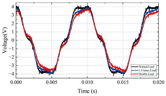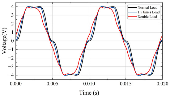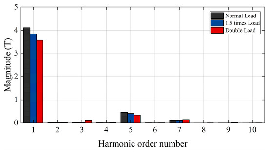 As shown in Figure 17, the trend in the no-load back EMF is consistent with the trend in the surface magnetic energy. As the overload increases, the amplitudes of both the fundamental wave and the fifth harmonic decrease, which is shown in Figure 18.As Table 6 shows, the THD of back EMF in normal load case is 11.6%, reduces to 11.0% after the 1.5 times case, and decreases to 10.6% in the double case.