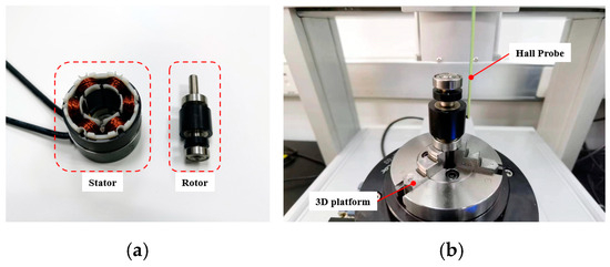 The experiments were designed using a BLDC equipped with a bonded Nd-Fe-B magnet ring (Grirem Advanced Materials, Beijing, China), as shown in Figure 12a, which was magnetized in the same way as in the FEM analysis. Figure 13a shows the schematic diagram of the load test, and the motor is a selected closed-loop control. To simulate actual overloading and avoid motor damage, the hysteresis damper (HaiBoHua, Beijing, China) was controlled using the computer program, and the intermittent pulse loads are applied to the motor to simulate the effect of motor overload. Each load application time was not less than one mechanical cycle. We measured the Bs using a high-precision Tesla probe (Forever Elegance Technology, Loudi City, China), which is shown in Figure 12b. The DMF diagnosis is performed by measuring the single-phase back EMF of the motor in Figure 13b.